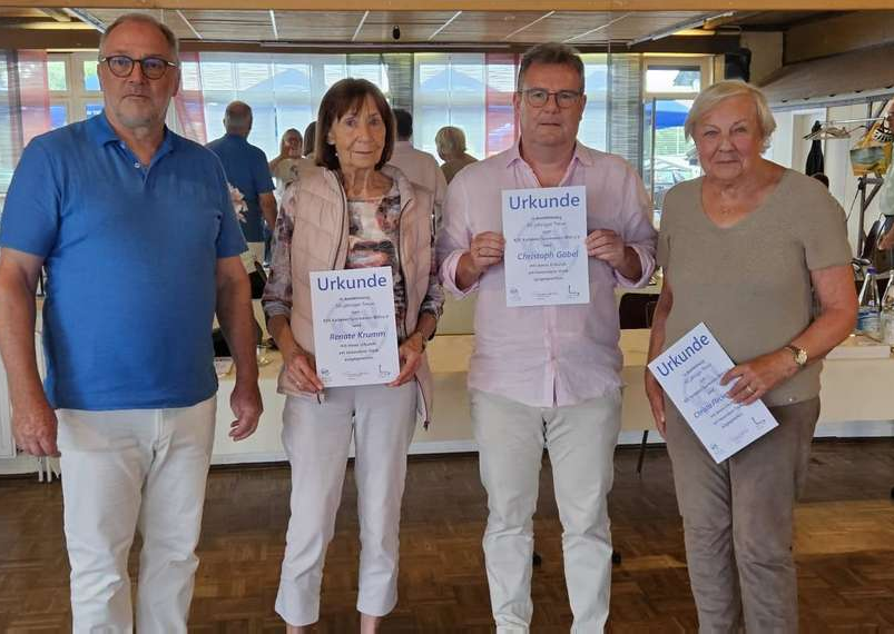 Von den über 30 langjährigen Mitgliedern des KSV hatten nur 18 zugesagt, dies war wohl der Ferienzeit sowie Krankheiten geschuldet. Die Anwesenden erhielten vom Ehrenratsvorsitzenden ihre Urkunde überreicht. Zudem waren Kaffee und ein Kuchenbüfett vorbereitet worden.